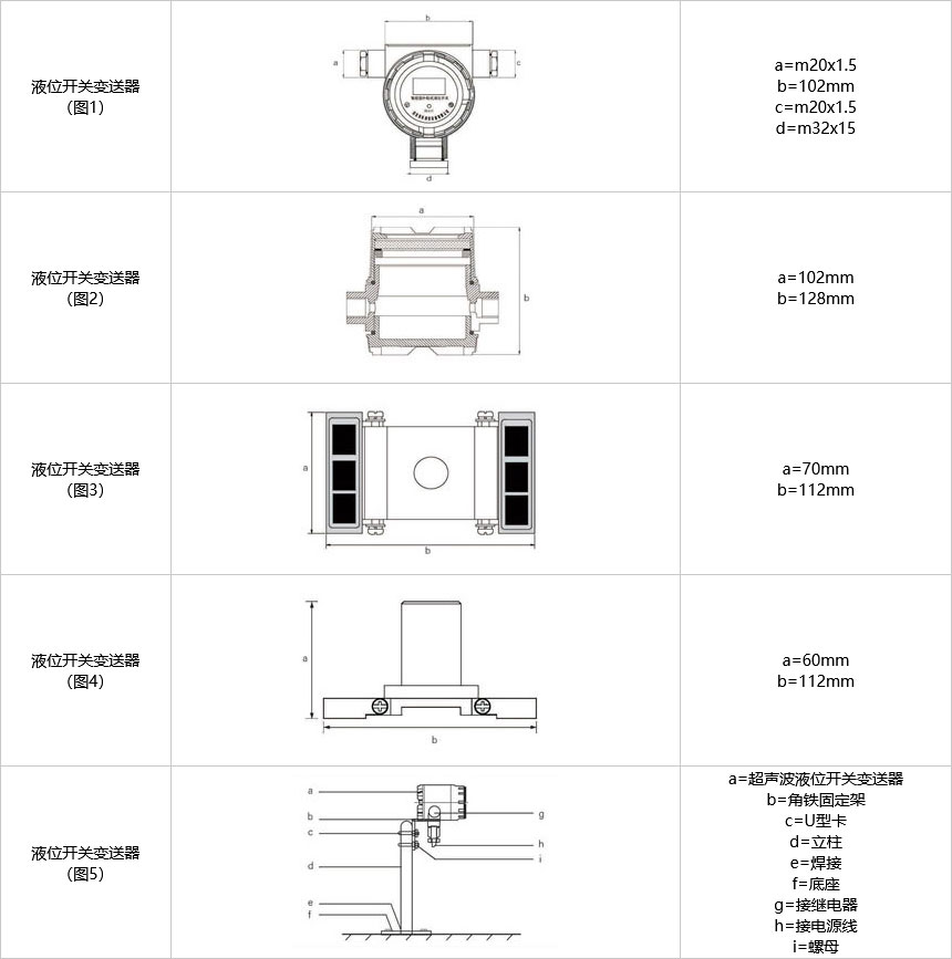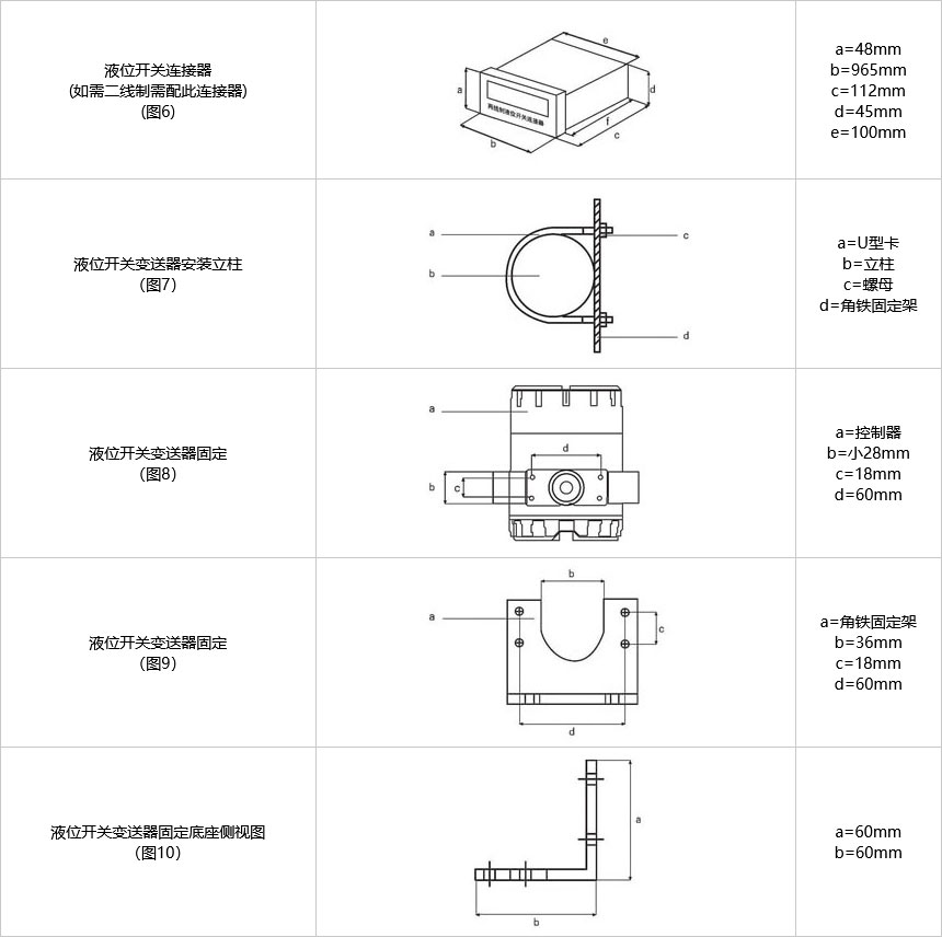液位開關變送器固定參照圖5、圖7、圖8、圖9、圖10